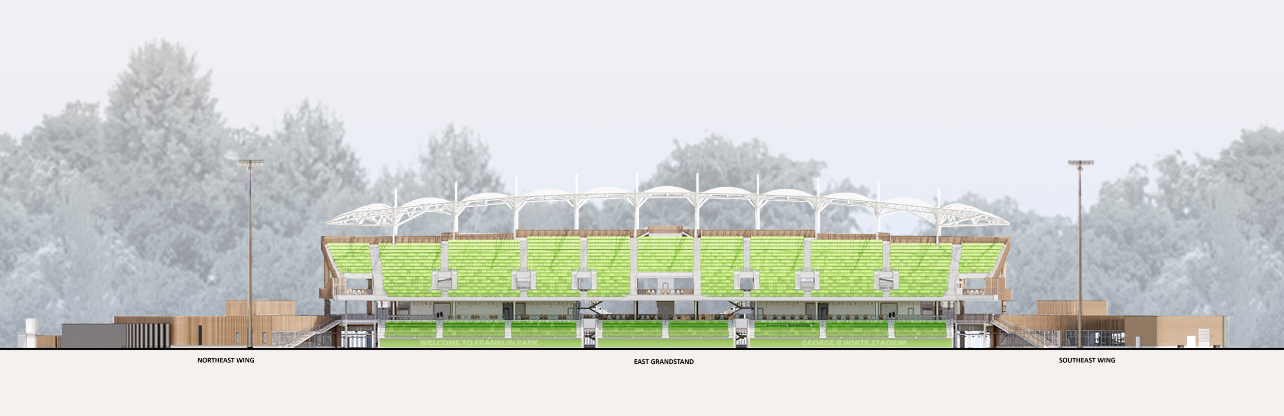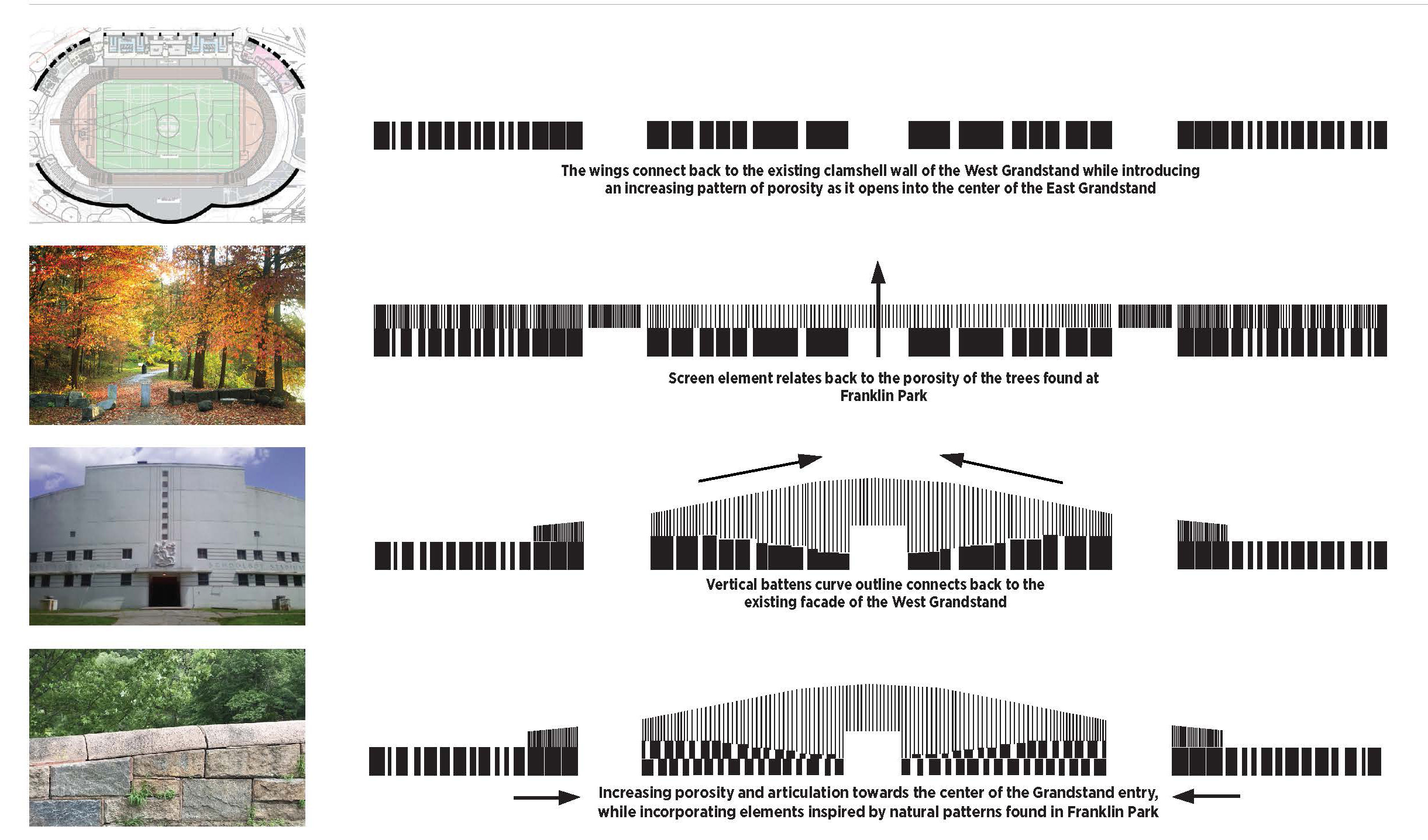 The design works within the contours of the existing site, ensuring that renewed athletic facilities complement — rather than compete with — the century-old landscape. The design of the building combines complementary forms of the original "clamshell" wall being retained on the West side of the stadium and a contextual response to the Franklin Park environment. The east façade’s vertical forms reference the well-established trees that line the surroundings of the “Playstead” area of the park, which Olmstead designed and designated for a variety of recreational activities. Inside the stadium, wood tones and a sloped canopy linking the two sides create a sense of warmth and unity.
