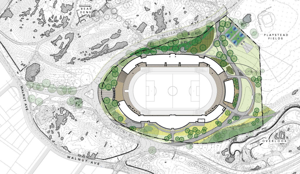 Franklin Park is the biggest and final piece of Olmstead’s visionary park plan known as the Emerald Necklace, an 1,100-acre chain of green space that links neighborhoods through and around Boston in a meandering series of intimate and expansive green spaces offering a range of vistas and experiences. In addition to the stadium, the park is also home to the Franklin Park Zoo, an 18-hole golf course, baseball fields and tennis and basketball courts. The 10,500-seat (i.e., concrete benches) stadium was completed in 1949 for Boston Public Schools (BPS) and in the years since has become a dilapidated icon of deferred maintenance. Various plans to upgrade the facility as long ago as the 1980s have been shelved repeatedly over the decades.