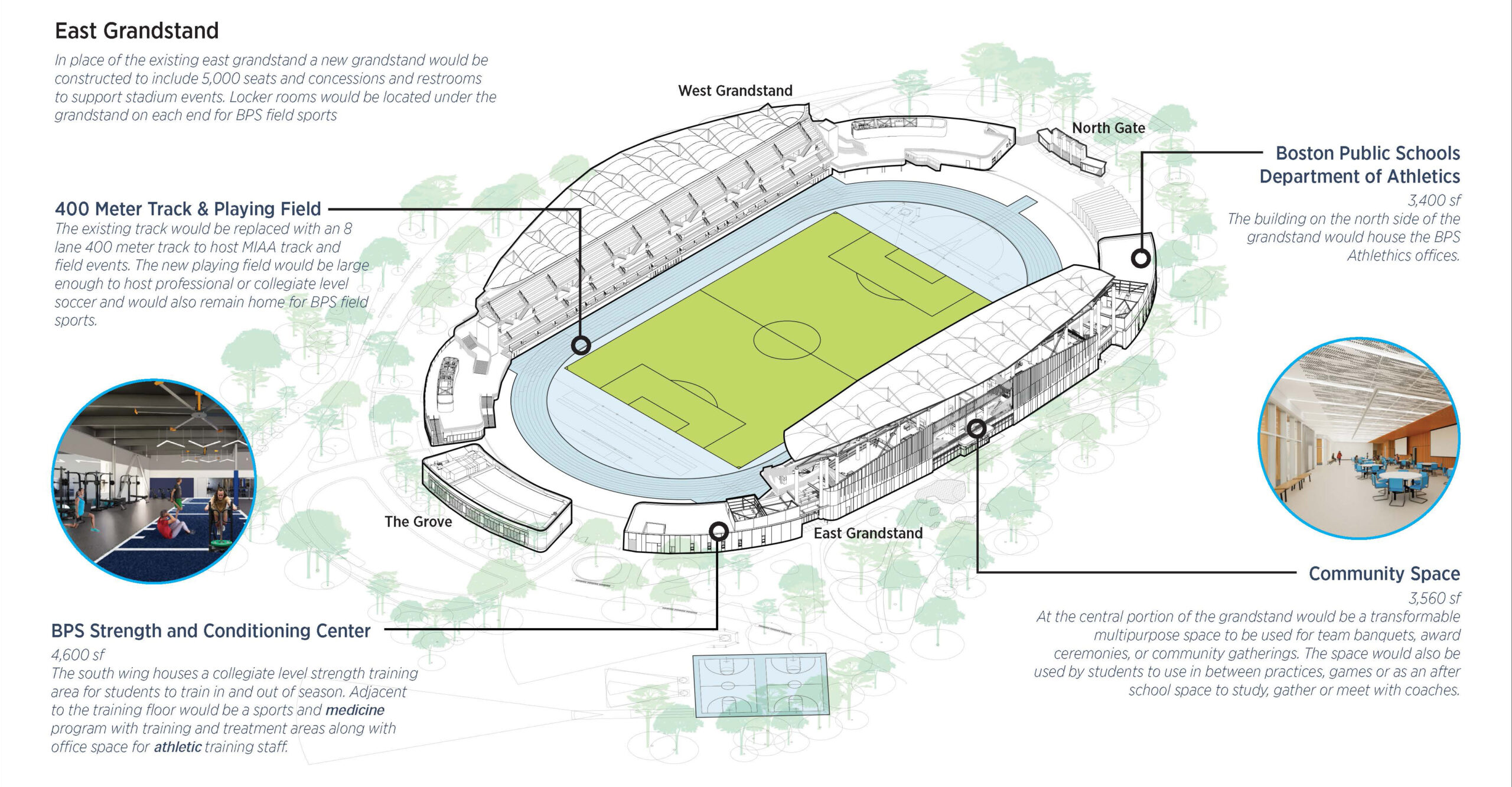 Every Boston Public School will have access to these facilities — which range from a MIAA-compliant eight-lane track to a field sized for professional and collegiate soccer. A new 5,000-seat east grandstand, with concessions and restrooms, will anchor game-day experiences and allow the stadium to host high school championships, city tournaments, and everyday training.